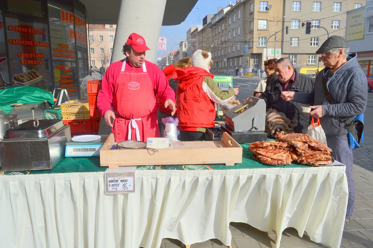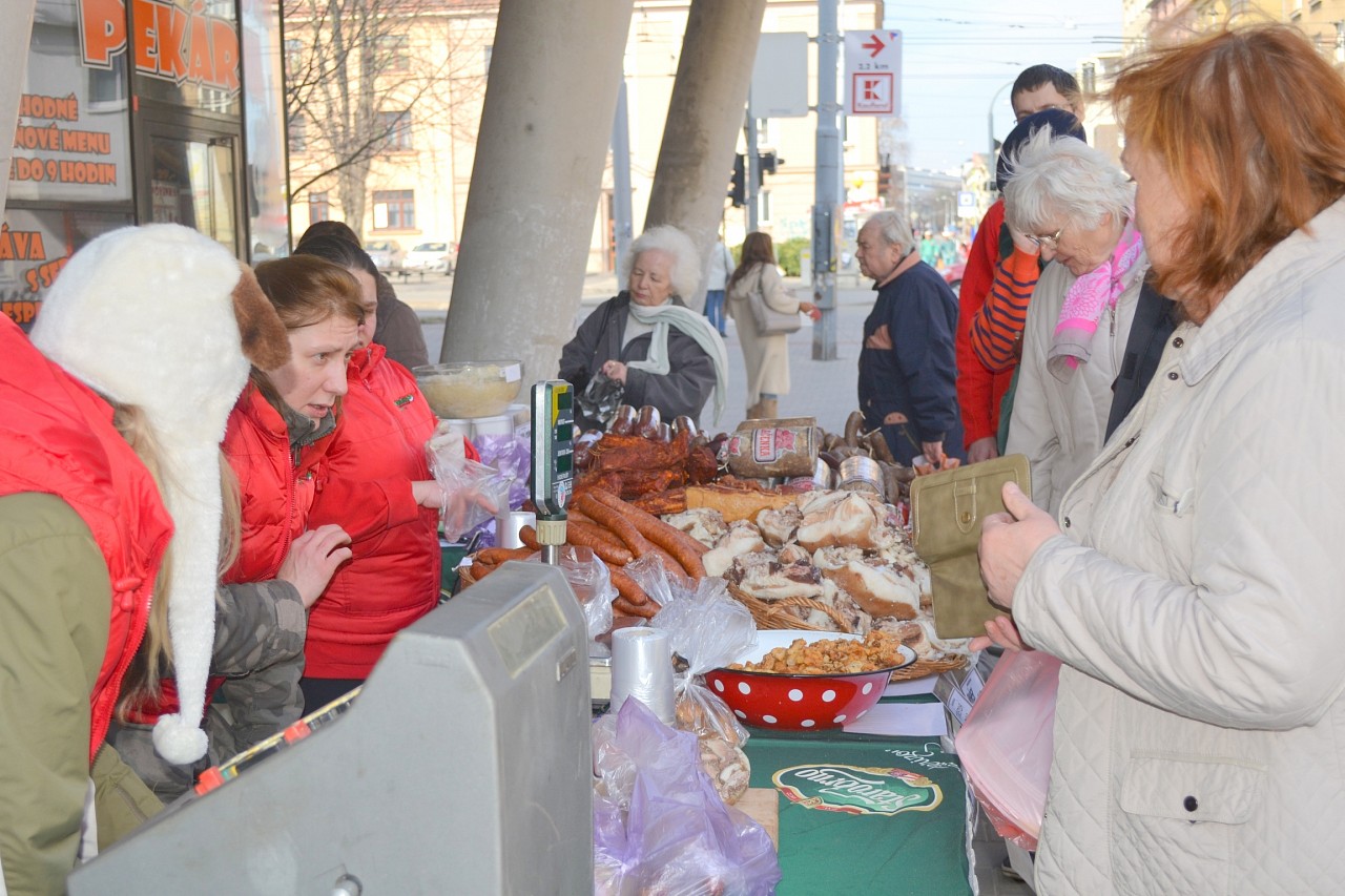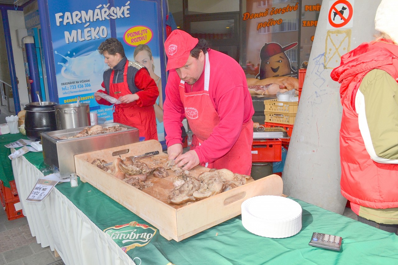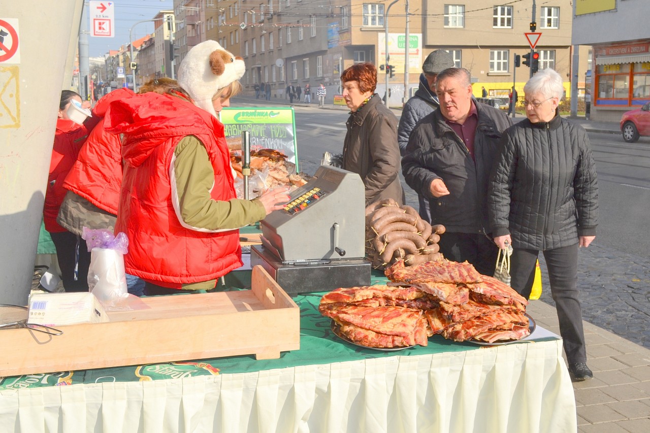 Zabíjačkové hody před prodejnou Purkyňova 35d v Brně.