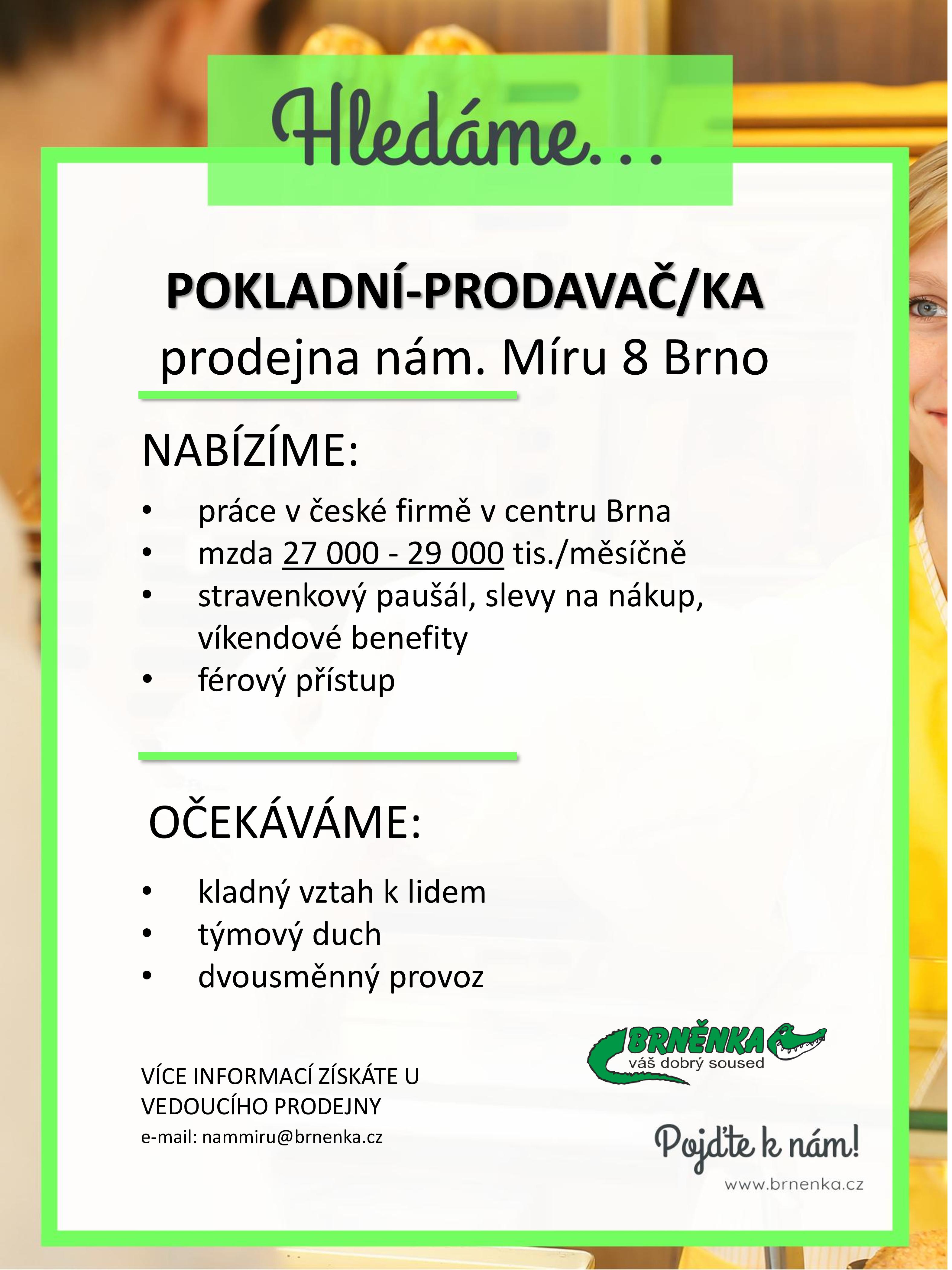 Nabízíme: turnusové směny, práci v centru Brna, férový přístup, Stravenky a slevy na nákup.